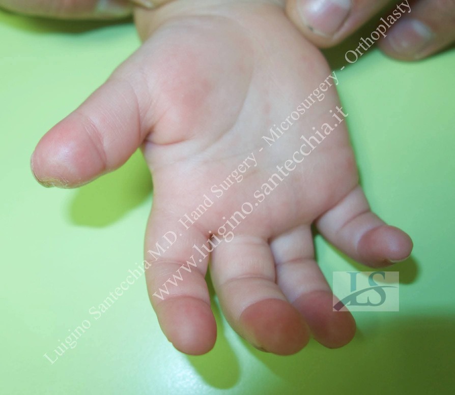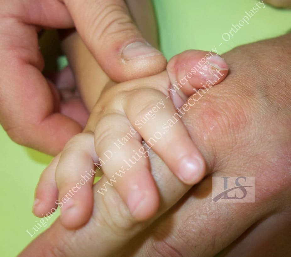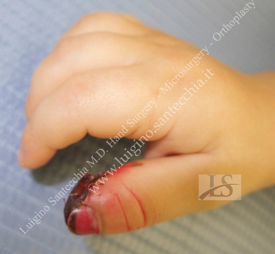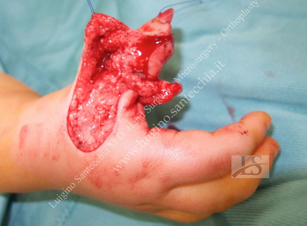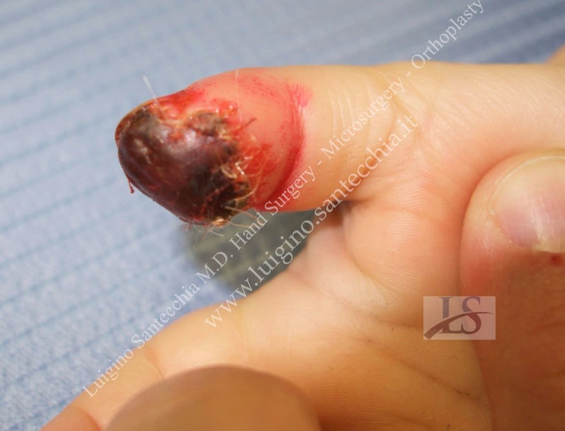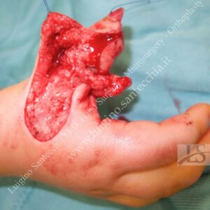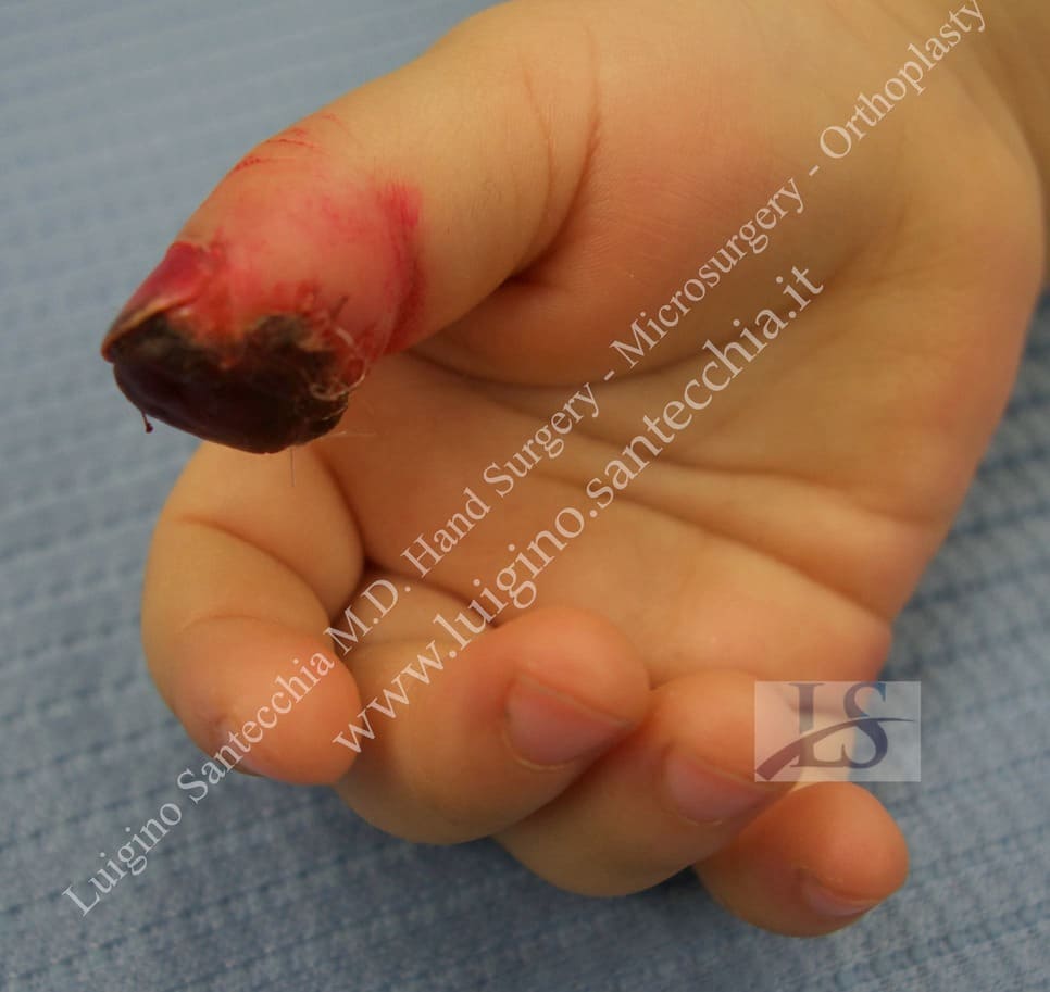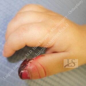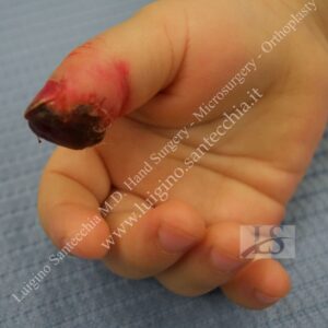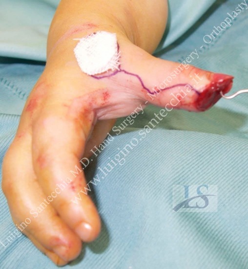 Flute beak amputation of the thumb with bone phalanx exposure. Removal of necrotic tissues and cover with Francesco Brunelli fasciocutaneous flap. Final result: normal functionality and fine grasping.
